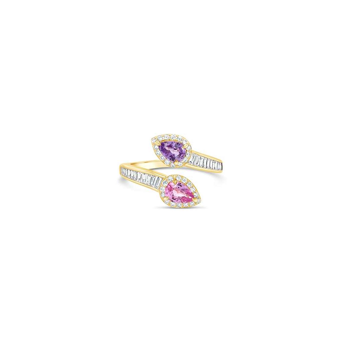 Anillo de oro rosa 18k con 1 zafiro rosa y 1 zafiro morado, con 30 diamantes corte brillante y 24 diamantes corte baguette