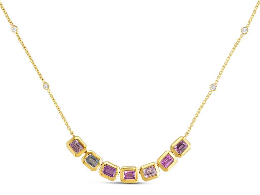 Collar de oro amarillo 18k con 7 zafiros de colores y 4 diamantes corte brillante