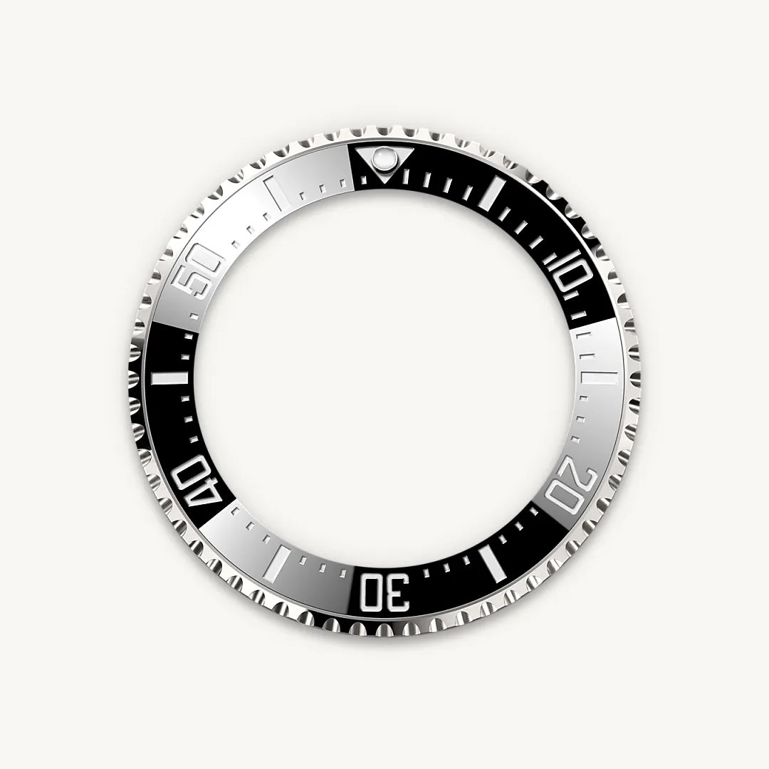 El bisel giratorio unidireccional graduado 60 minutos del Deepsea Challenge permite visualizar los tiempos de inmersión y descompresión con total seguridad. Está equipado con un disco de bisel Cerachrom negro patentado y fabricado por Rolex en una cerámica prácticamente imposible de rayar o alterar por los rayos ultravioleta. La graduación se obtiene por PVD (Physical Vapour Deposition) de una fina capa de platino. La esfera aloja grandes índices y agujas Chromalight, recubiertas de un material luminiscente de larga duración, que emite un color azul para una excelente legibilidad en la oscuridad.