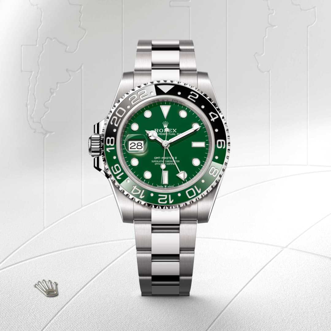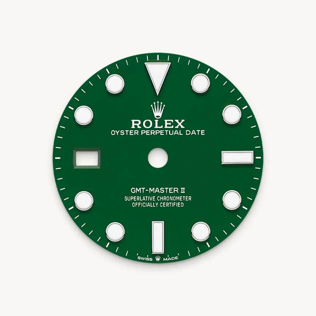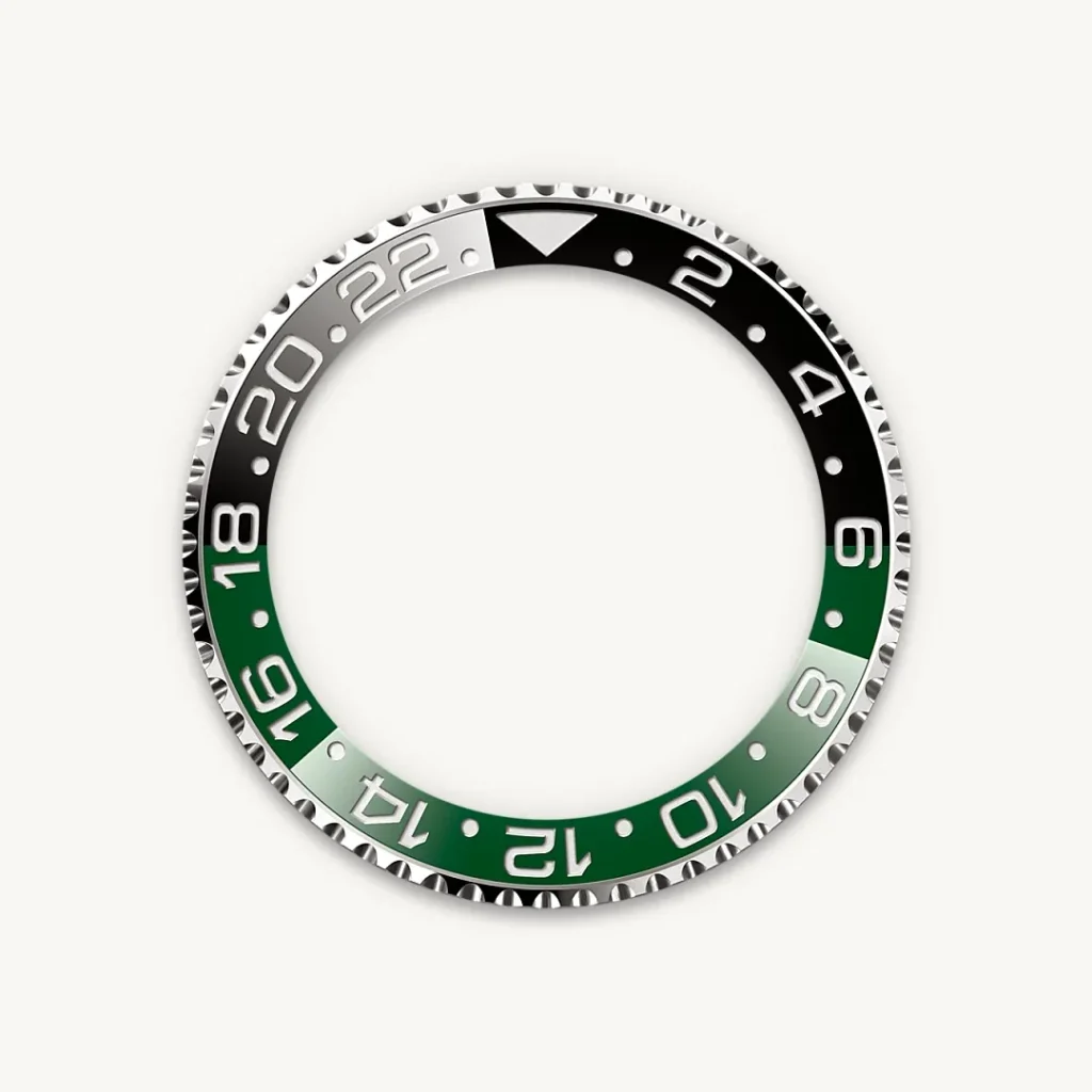 Este modelo presenta una esfera cerámica verde y un disco de bisel Cerachrom bicolor en cerámica verde y negra bicolor. El GMT‑Master II dispone de una aguja adicional que da la vuelta a la esfera en 24 horas y complementa a las tradicionales agujas de las horas, minutos y segundos, así como de un bisel giratorio bidireccional graduado 24 horas. La aguja adicional de 24 horas, con su color distintivo, indica la hora de referencia, la del lugar de residencia, en un primer huso horario que se lee sobre la graduación del bisel. La hora local del viajero puede ajustarse fácilmente mediante saltos de hora en hora gracias a un astuto mecanismo controlado por la corona: la aguja de las horas puede ajustarse hacia delante o hacia atrás, de forma independiente del minutero y el segundero. Esto permite al viajero adaptar su nuevo huso horario sin que afecte a la precisión. El disco de bisel Cerachrom, por su parte, presenta una combinación inédita de colores: un negro y un verde exclusivo de este modelo.