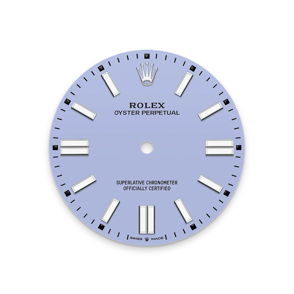 Los tonos creados para la gama Oyster Perpetual presentan en un principio forma de laca que ha de aplicarse con precisión y de forma regular con el fin de obtener una superficie uniforme. La operación se realiza en un entorno con atmósfera controlada para evitar cualquier mota de polvo o impureza. Una tras otra, seis capas de laca se depositan sobre el disco de latón que conforma la base de la esfera. A continuación se aplica un barniz antes del pulido, para conferirle al color todo su brillo y luminosidad. Posteriormente se tampografían las distintas inscripciones, mientras que los índices y la corona se remachan a mano. Resplandeciente e impecable, la esfera está lista entonces para su montaje sobre el movimiento durante el ensamblaje del reloj.