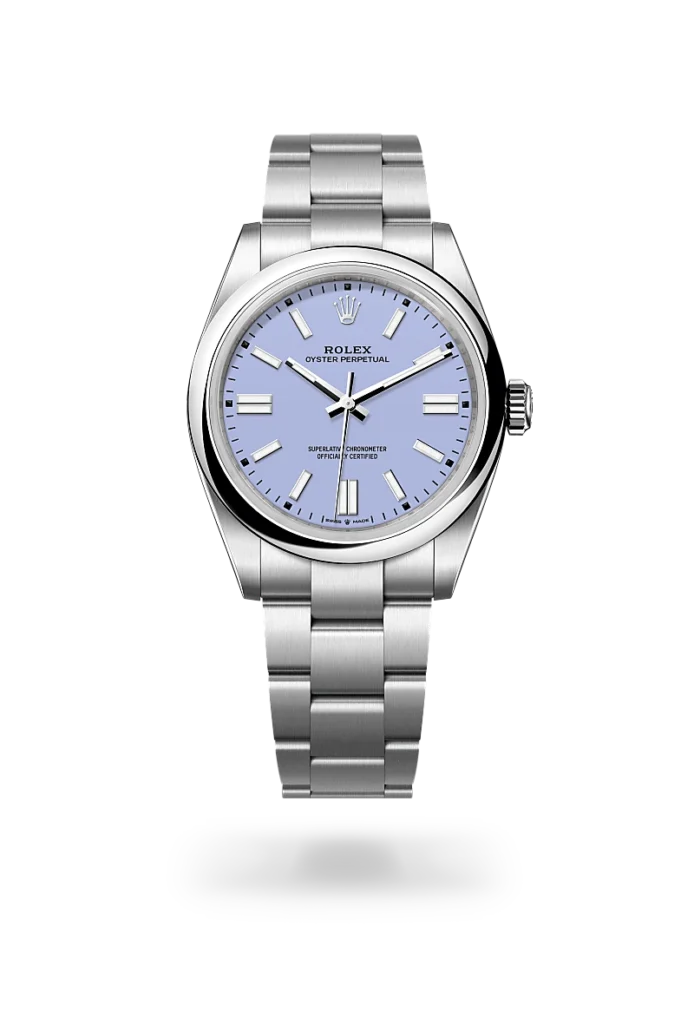El Oyster Perpetual proporciona una fiable y precisa visualización de las horas, los minutos y los segundos. Las diferentes modalidades del reloj se distinguen por sus esferas en varios colores, sutiles o vibrantes: una gama de diferentes rostros que garantiza que siempre hagan gala de un toque de modernidad. Desde beis, lavender o pistachio lacadas mate, hasta rosa candy, verde, azul turquesa, negra, lacada med blue o plateada con acabado tipo sol, estas esferas combinan con cualquier estilo. El Oyster Perpetual está disponible en cinco tamaños de caja: 28 mm, 31 mm, 34 mm, 36 mm o 41 mm. Ofrece la mayor elección de diámetros para una gama de relojes Rolex.