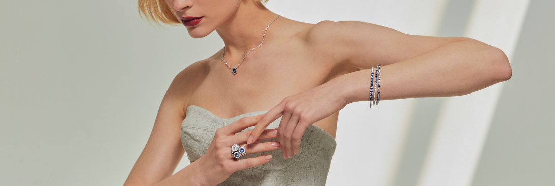 Anillo de oro blanco con 1 zafiro azul y diamantes.